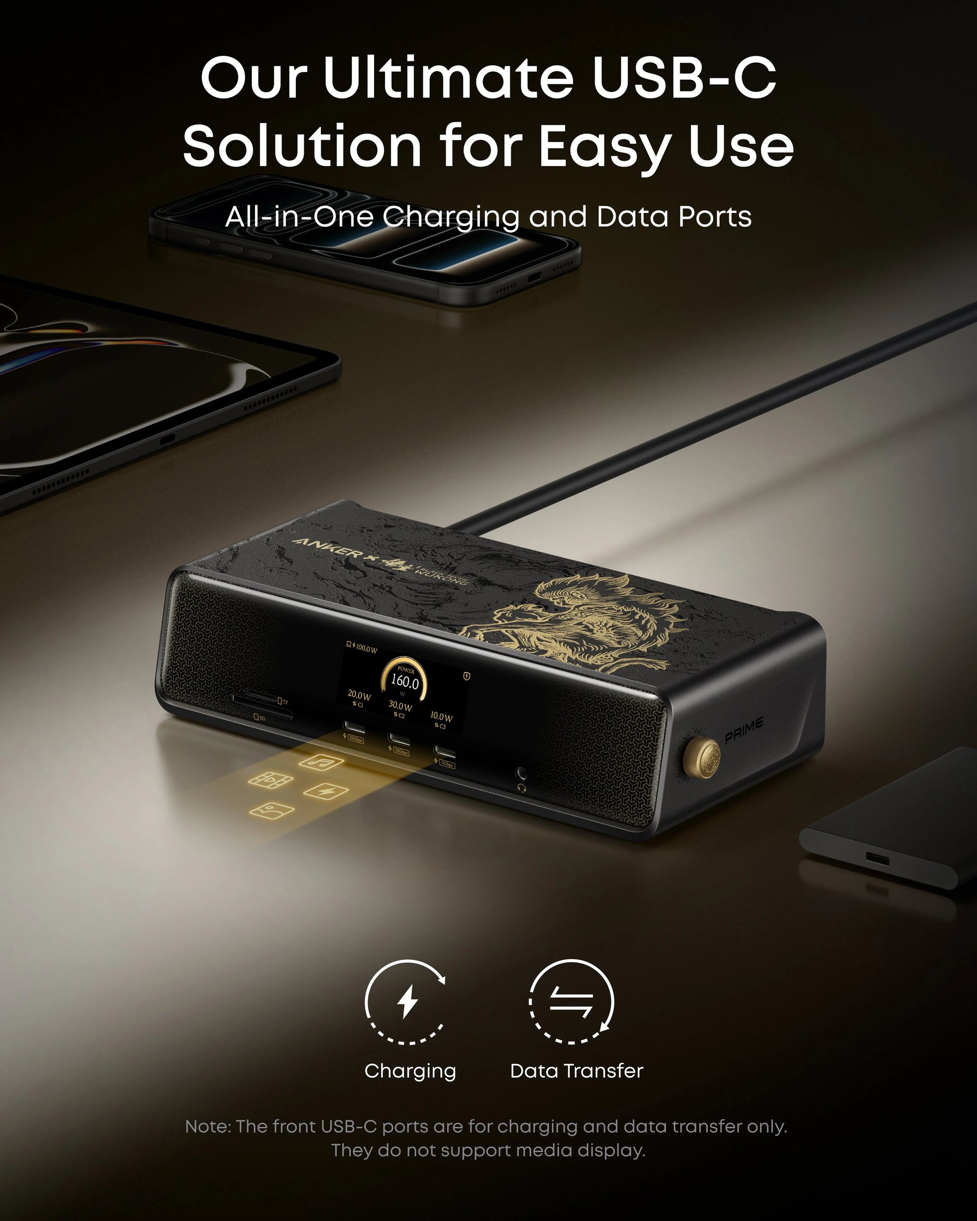 Every USB-C port is designed for both charging and data transfer. The upstream port supplies up to 140W to power high-performance laptops, while each front USB-C port delivers up to 100W fast charging for connected devices.